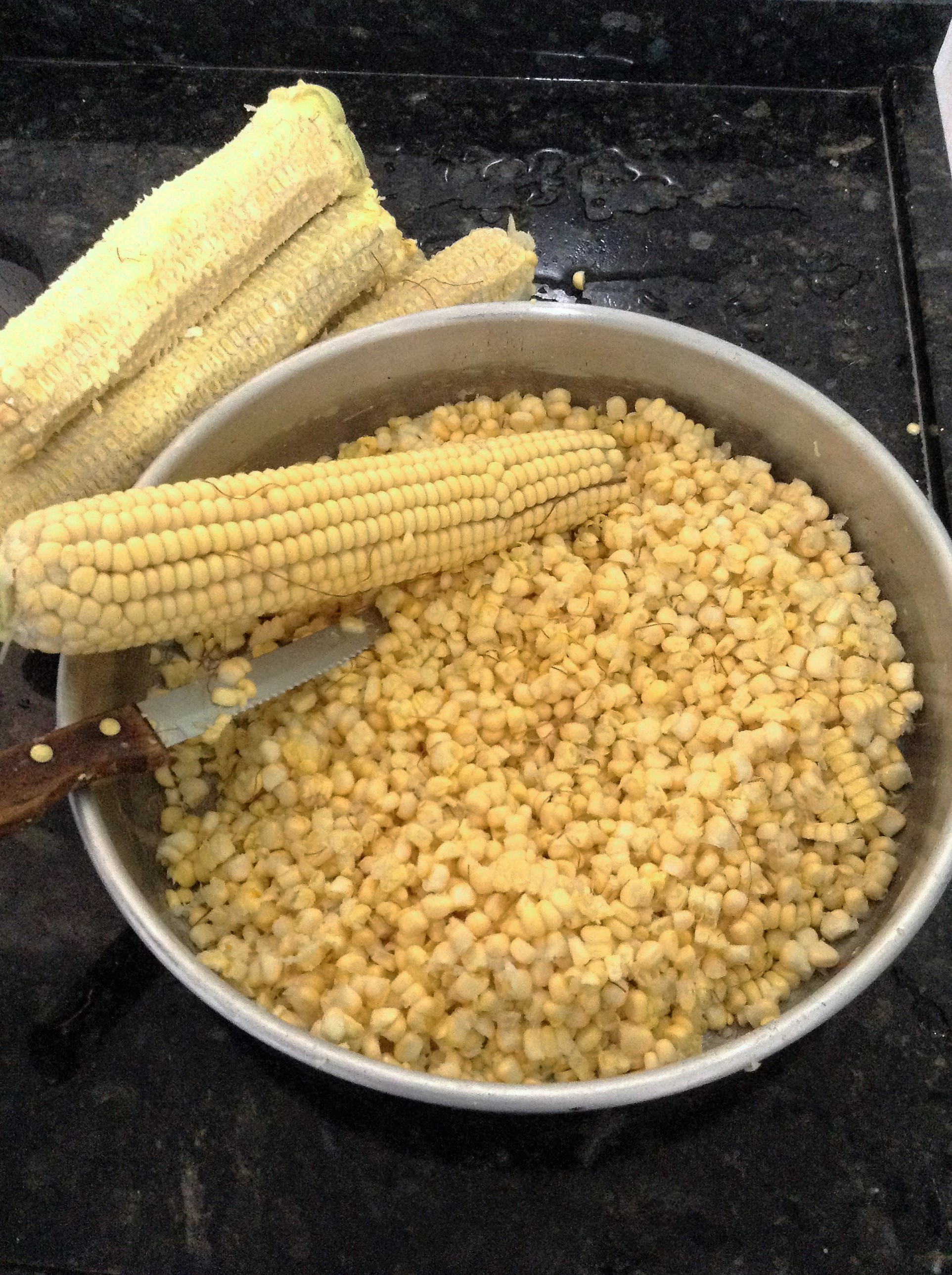 Nesse dia eu fiz um recheio de frango, milho e requeijão, mas faço muito com recheio de carne moída.