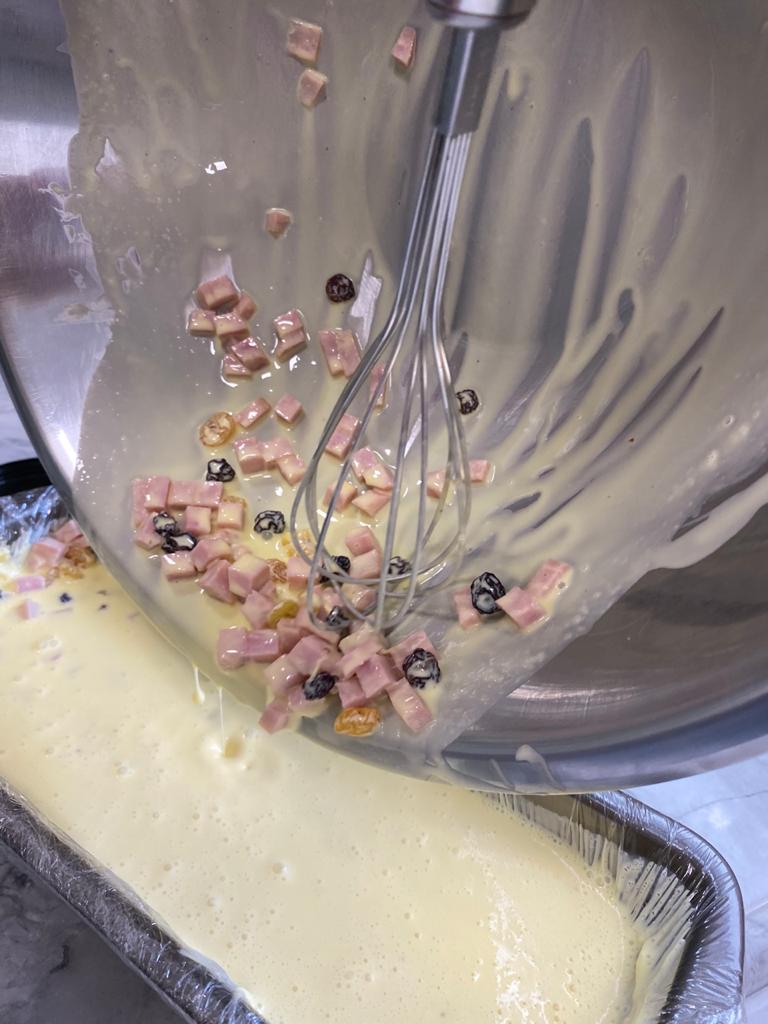 Em um pirex, coloque alternadamente o lombo e as fatias do abacaxi.