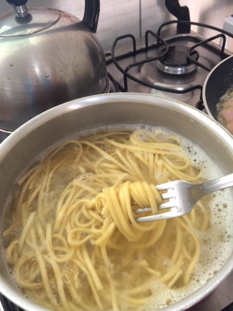 Em seguida, coloque o macarrão, complete com água fervente e deixe cozinhar até a massa ficar ao dente.