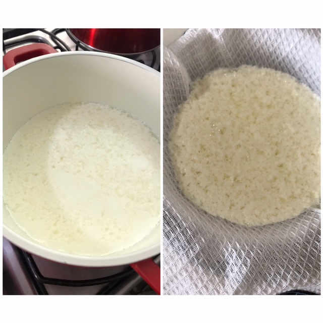 Primeiro, leve o leite para ferver rapidamente. Apague o fogo e junte o vinagre. Na mesma hora ele vai talhar (parece mágica). Pegue uma peneira e coe (eu coloquei um pano, mas vi que não é necessário) até escorrer todo o líquido.