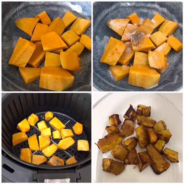 Cortei em cubinhos, temperei com sal e pimenta do reino e um fio de azeite. Coloquei na bandeja da airfryer e levei por 10 minutos em 200 graus.