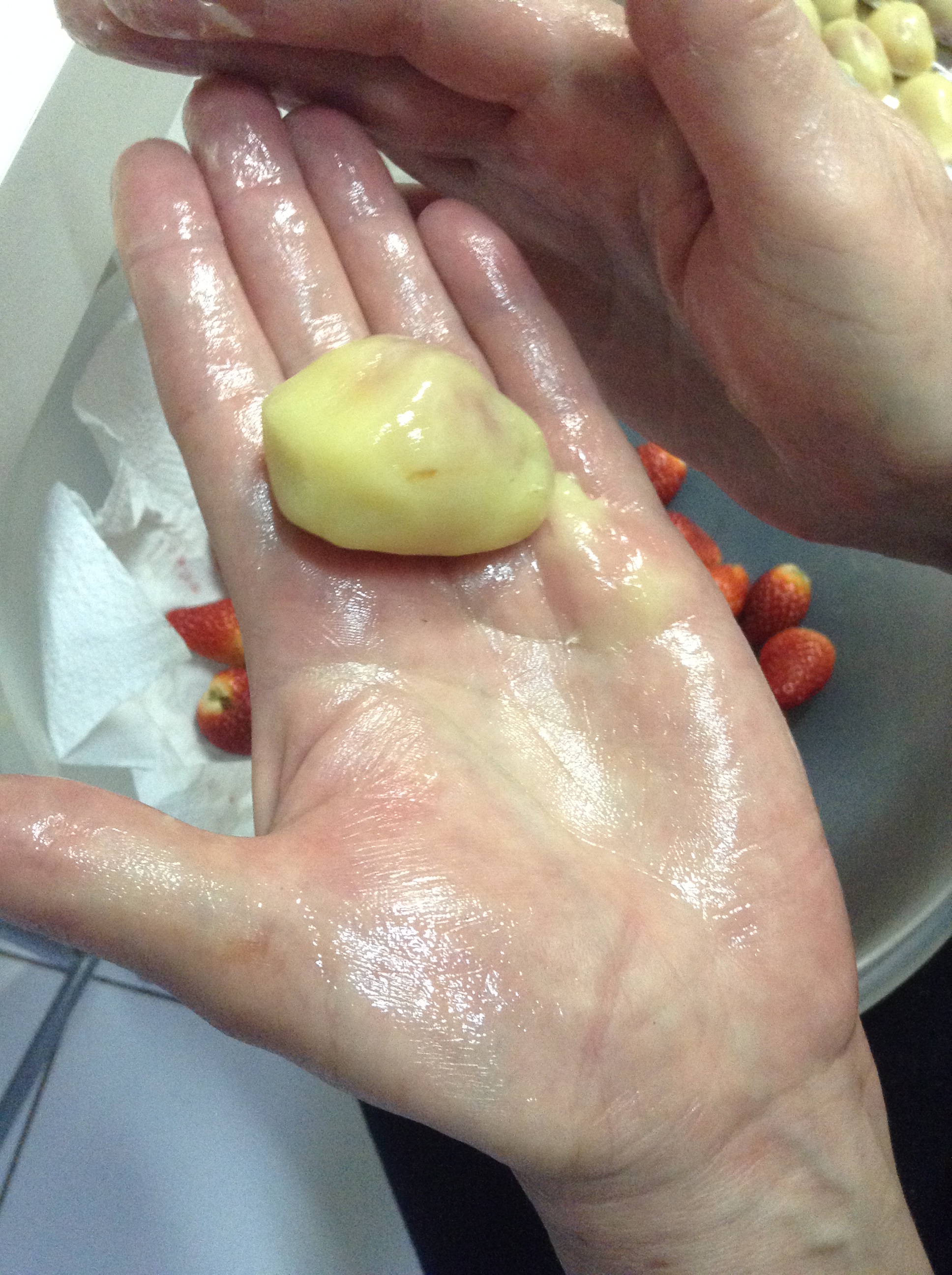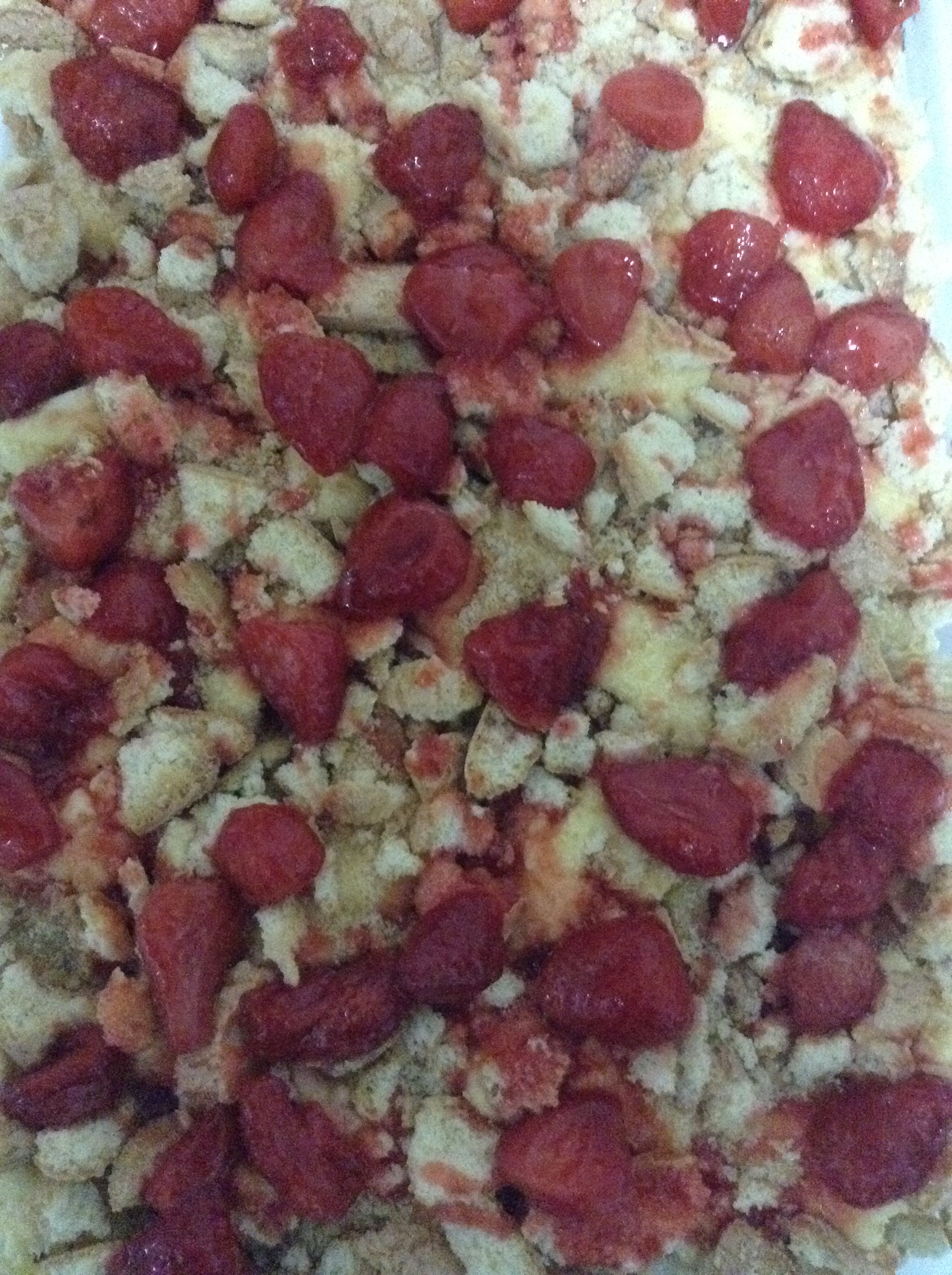 Para retirar das forminhas, é só passar uma faca com cuidado nas bordas e virar em um pratinho colocando em cima a calda com morangos.