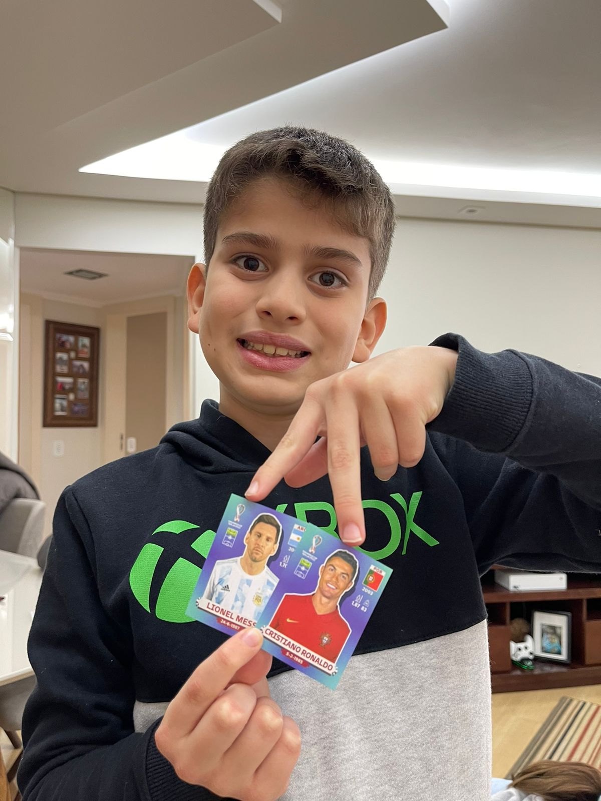 Aqui está o Heitor, feliz por ter conseguido o Messi e o Cristiano Ronaldo!