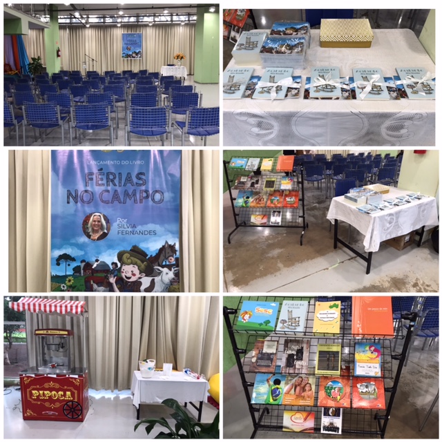 Bem, na primeira foto temos o auditório já arrumado; na segunda a mesa onde o Alexandre (super eficiente) sentou-se para a venda dos livros; na terceira foto o banner com a capa do livro feita pelo tambémeficiente André; a quarta foto uma visão da mesa com uma estante onde coloquei alguns dos meuslivros, antologias revistas e materiais didáticos nos quais participei; na quinta, o carrinho de pipoca que funcionou sem parar ao lado de uma mesa com águas e sucos; e na última uma visão mais perto da referida estante.