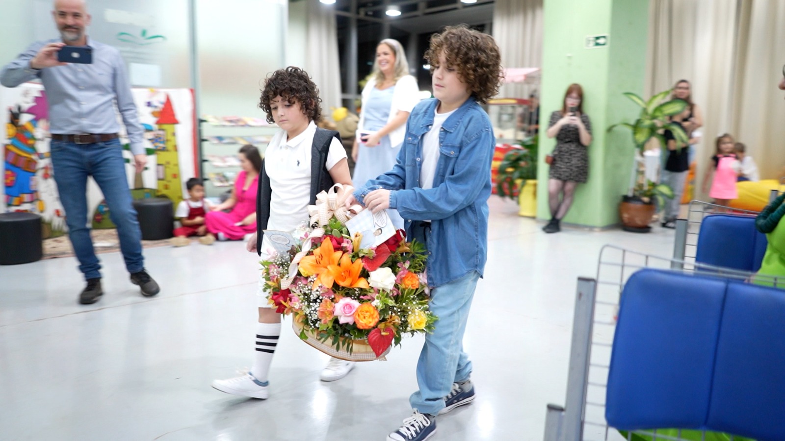 Nessa foto, aparecem meus netos Cesinha e Daniel, trazendo essa cesta maravilhosa de flores que, pelo jeito, estava bem pesada…