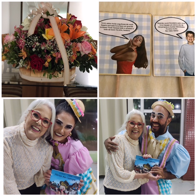 Essa maravilha de cesta de flores, recebi das mãos de meus netos Cesinha e Daniel que ainda falaram na frente de todos (estavam bem encabulados) e na segunda foto, as mensagens vindas de Angola dos meusnetos de lá: Isadora e Heitor; nas duas últimas fotos, estou com os artistas maravilhosos da Sou Arteque abrilhantaram nossa festa. No próximo teremos muitas fotos com eles.