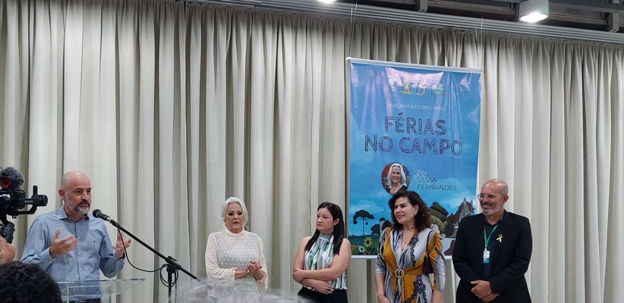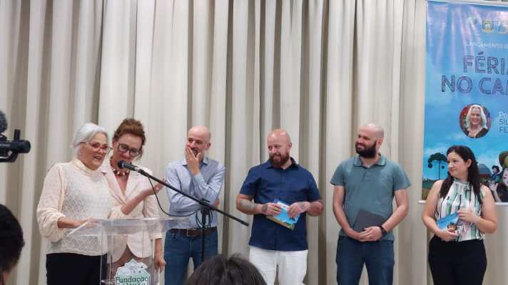 Nessa foto já estou discursando e fazendo homenagem aos queridos que muito me ajudaram nessa tarefa que mostro ao público: Giselta, meu filho Paulo Emílio que lá atrás, antes da pandemia, foi quem teceu comigo as primeiras ideias do livro; o ilustrador Tiago que viu (magistralmente) com meus olhos a criação do personagem Pedrinho; André (Moai Comunicação) que fez a diagramação e seguiuà risca o que eu pretendia; e Luciana, diretora da Biblioteca, que me foi de imensa ajuda na parte da informática.