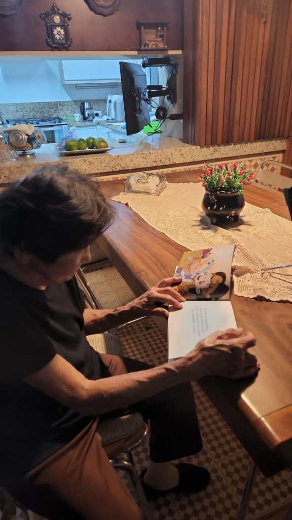E se vocês pensam que a história só interessa às crianças, vejam essa senhora de Maringá que recebeu o livro e lê com todo carinho: dona Geni Kioko Shimabukuro com94 anos! Que maravilha!