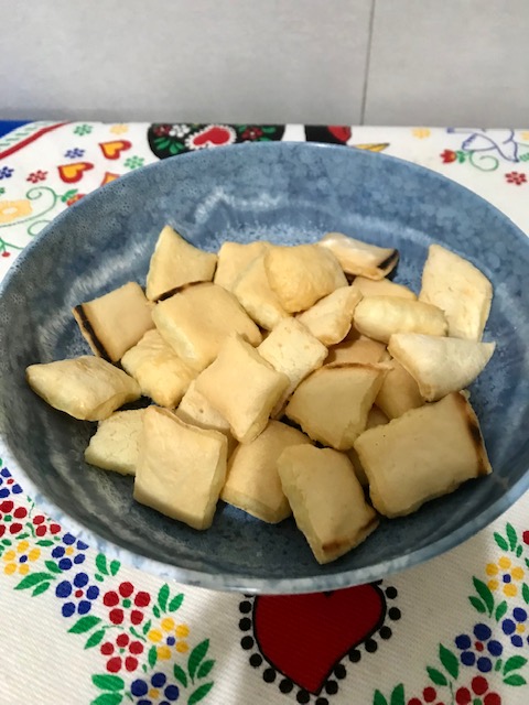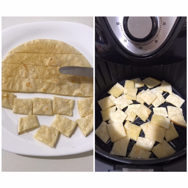 Agora, com uma faca, vá cortando em quadradinhos e leve à airfryer, 200º (já aquecida) por 10 minutos.