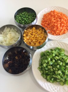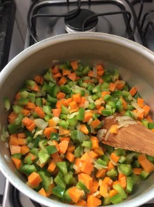 Depois o pimentão também cortado em pedacinhos pequenos.