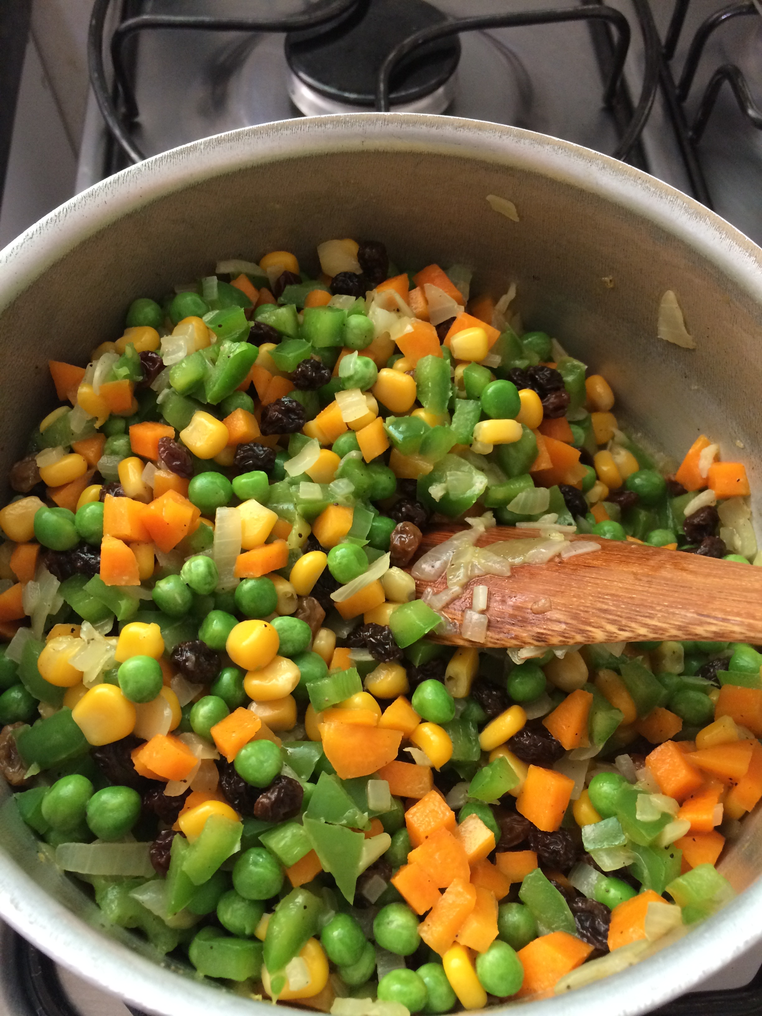 Junte o milho e ervilhas.