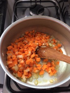 Junte a cenoura cortada em cubinhos bem pequenos.