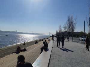 (Na Ribeira das Naus, em frente ao Tejo, algumas pessoas aproveitaram o sol do final de semana, mas mantendo distância uns dos outros).