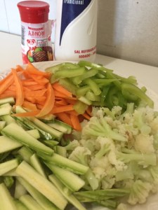 Primeiro dei uma leve cozida na couve flor e piquei fininho todos os ingredientes.