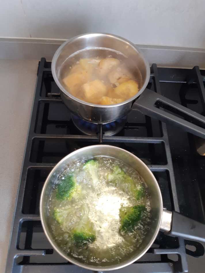 Na primeira foto, ele frito e depois com o suco e açúcar.