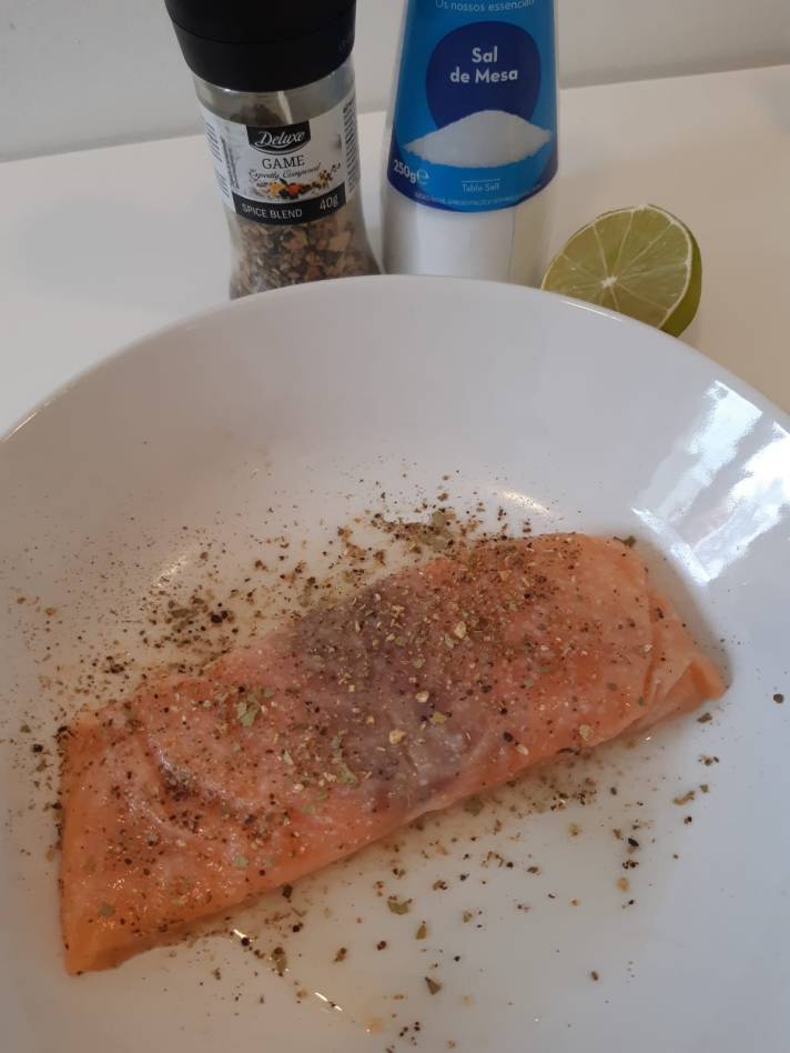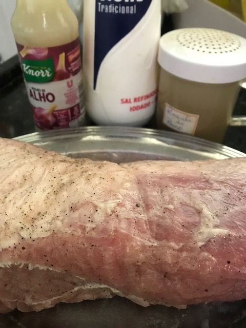 Primeiramente, tempere esfregando em toda peça o sal, alho (eu usei o molho de alho) e a pimenta.