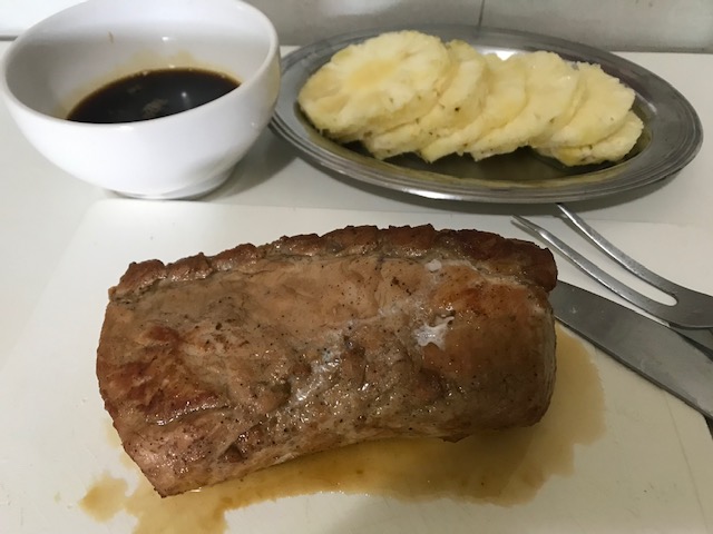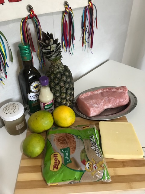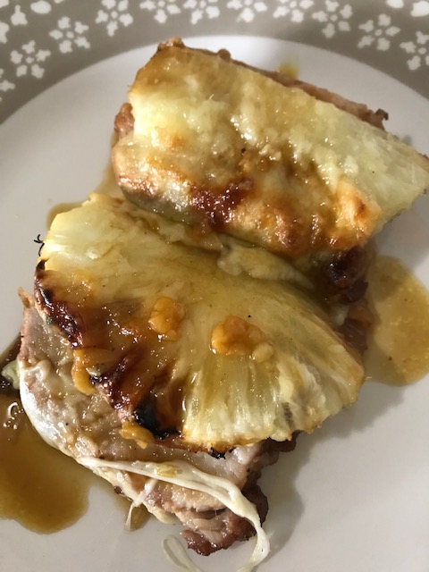 Com uma boa faca, corte em fatias o lombo e o abacaxi.