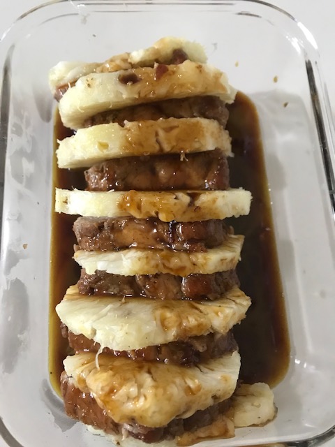 Em um pirex, coloque alternadamente o lombo e as fatias do abacaxi.
