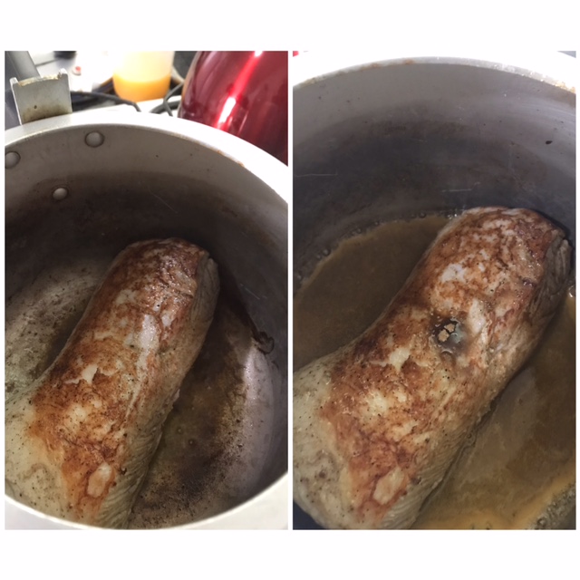 Retire, coloque o lombo em uma tábua e o molho da panela em uma tigelinha.
