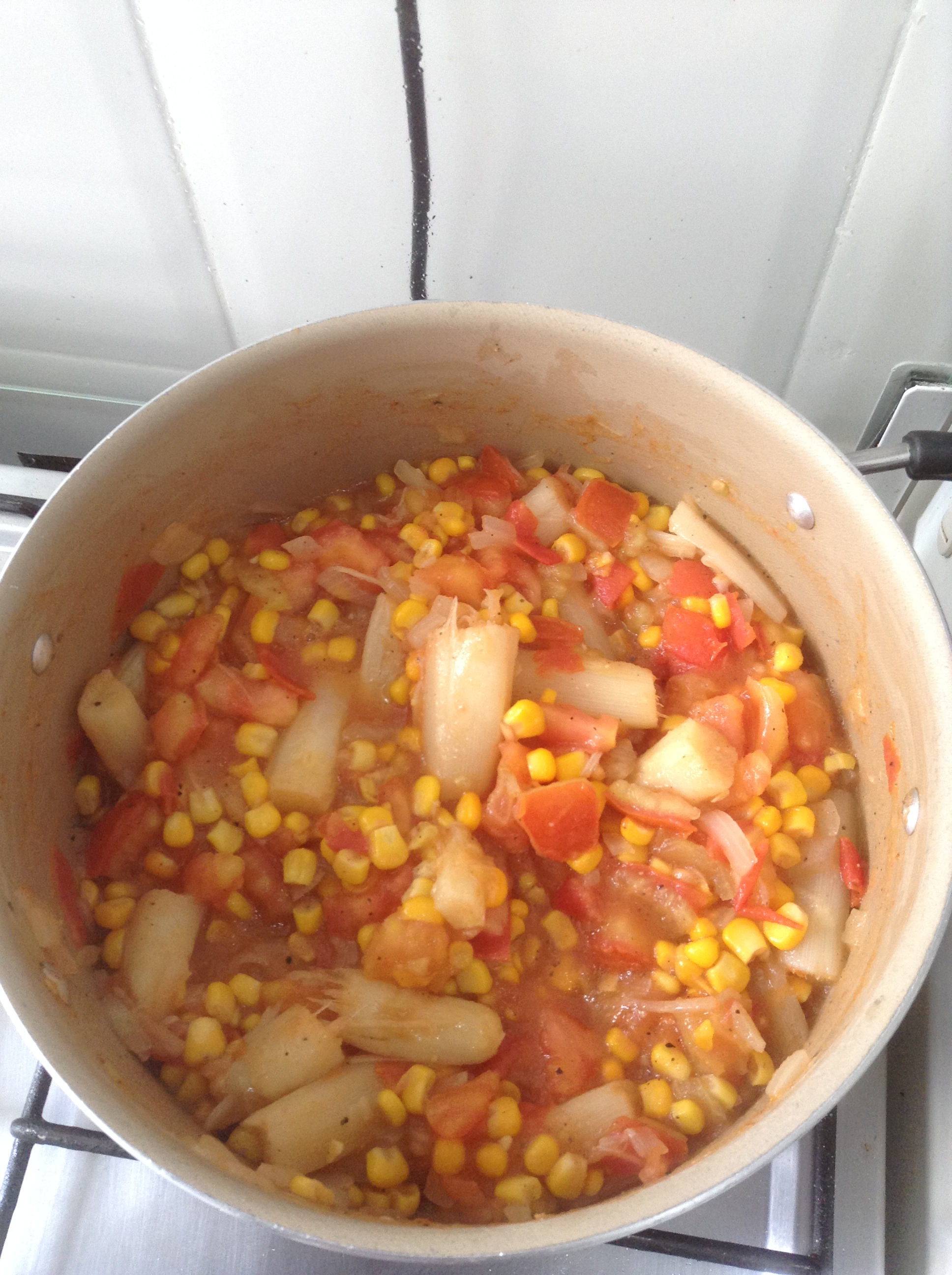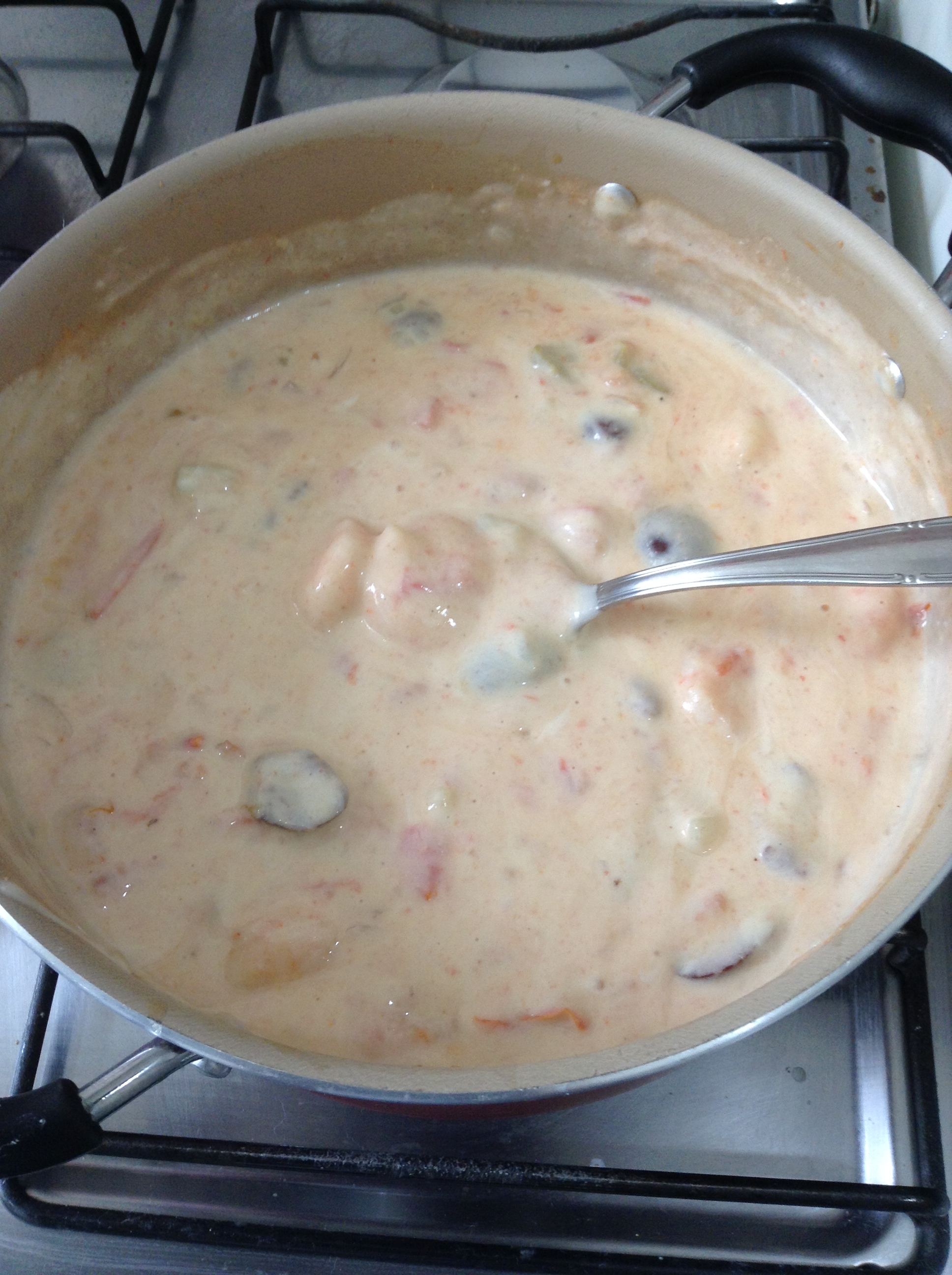Misture todos os ingredientes (menos o creme de leite) e leve para ferver levemente. Retire e deixe amornar. Junte o creme de leite e reserve.