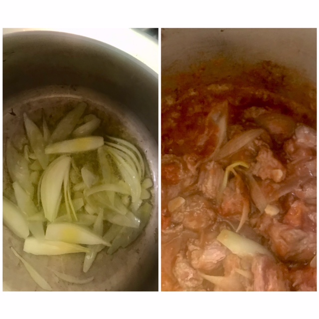 Primeiramente coloquei o azeite na panela de pressão e fritei a cebola; em seguida a carne e linguiça, temperei com o sal, alho e depois de uns minutos juntei os tomates e cobri com água. Deixei ferver até ver que as costelinhas estavam macias.