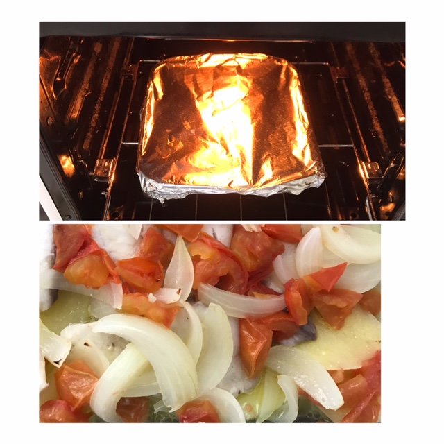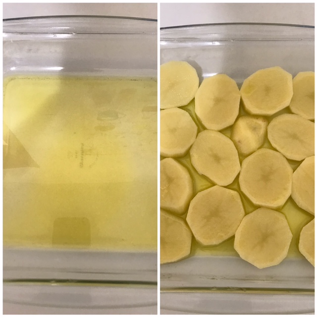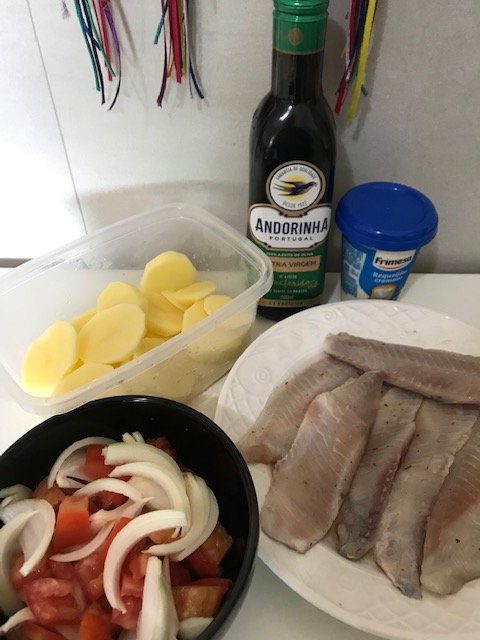 Cortei uma cebola em fatias e alguns dentes de alho; forrei um pirex com azeite e fiz essa primeira camada.