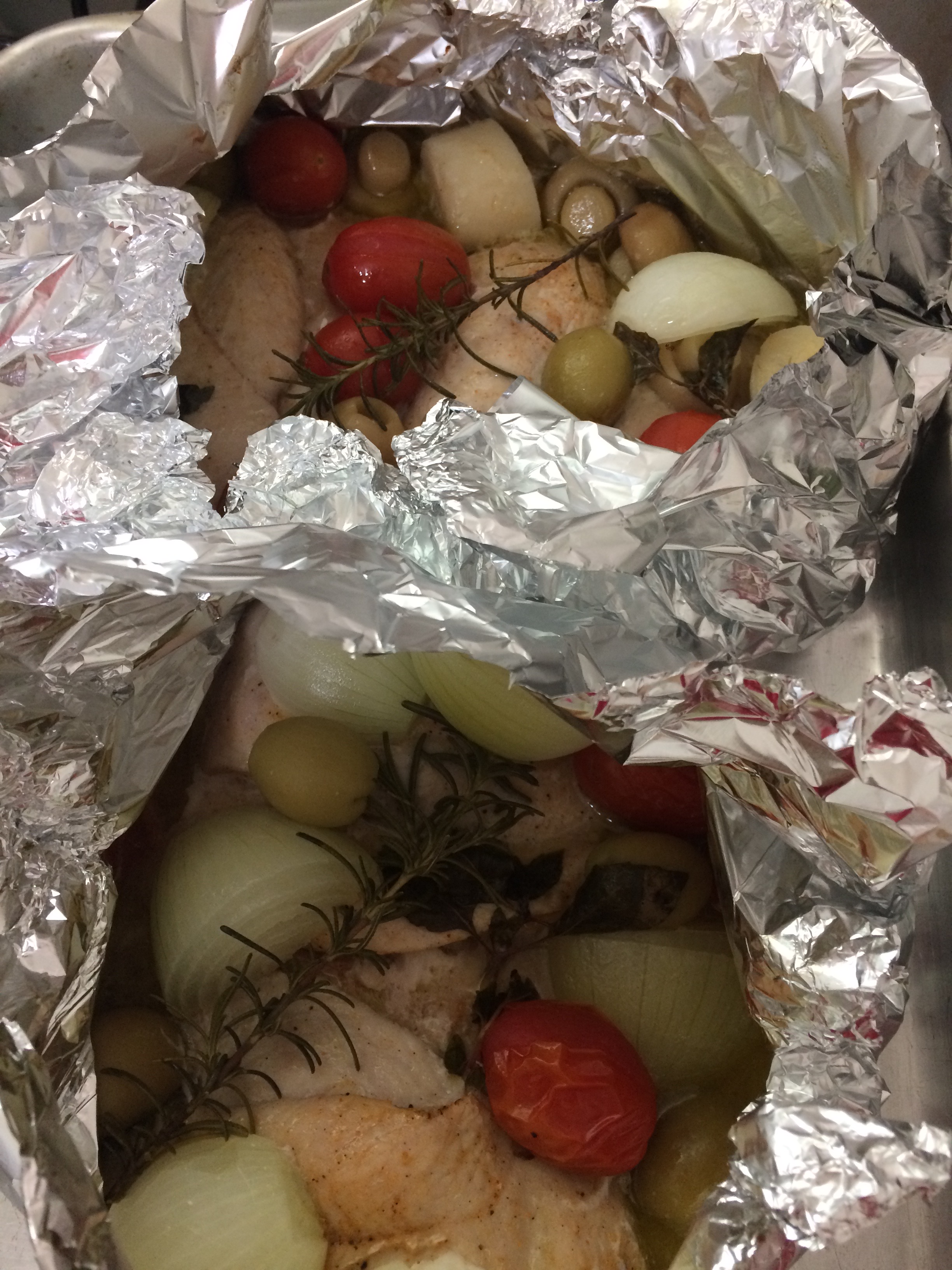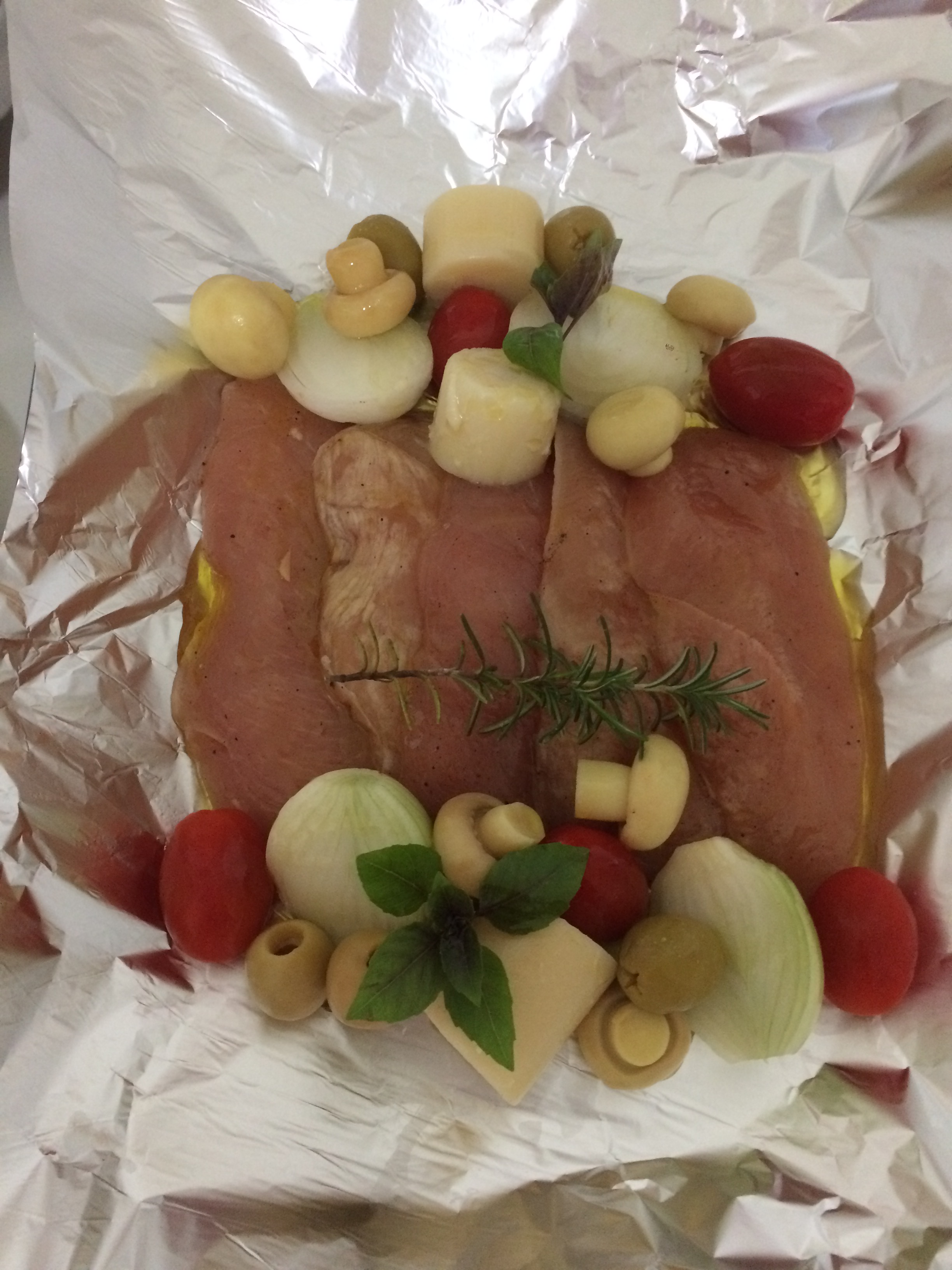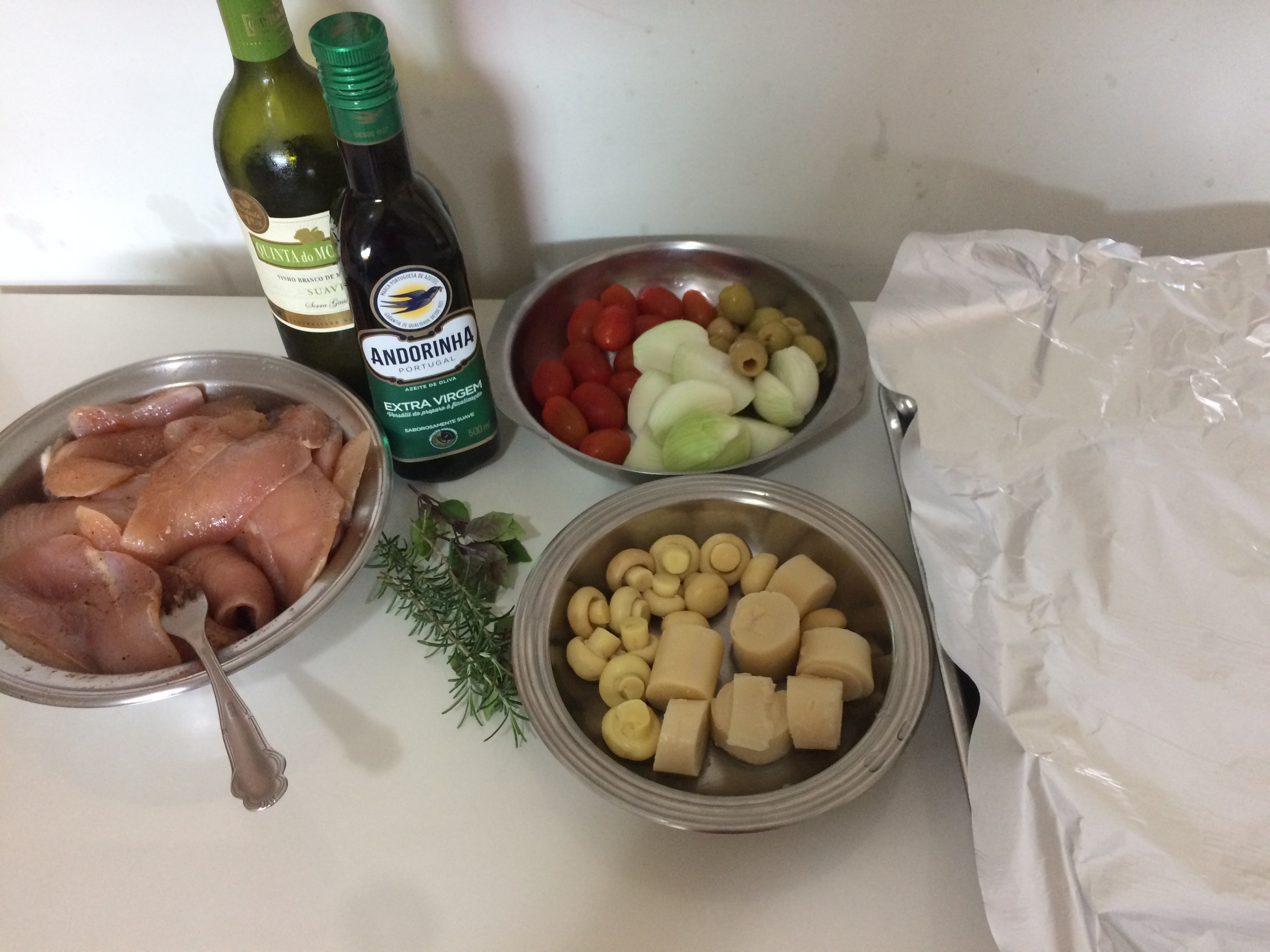 Tempere os filés de frango ou o peito inteiro desossado, com sal, pimenta do reino, páprica, tomilho, 1/2 xícara de vinho e azeite.