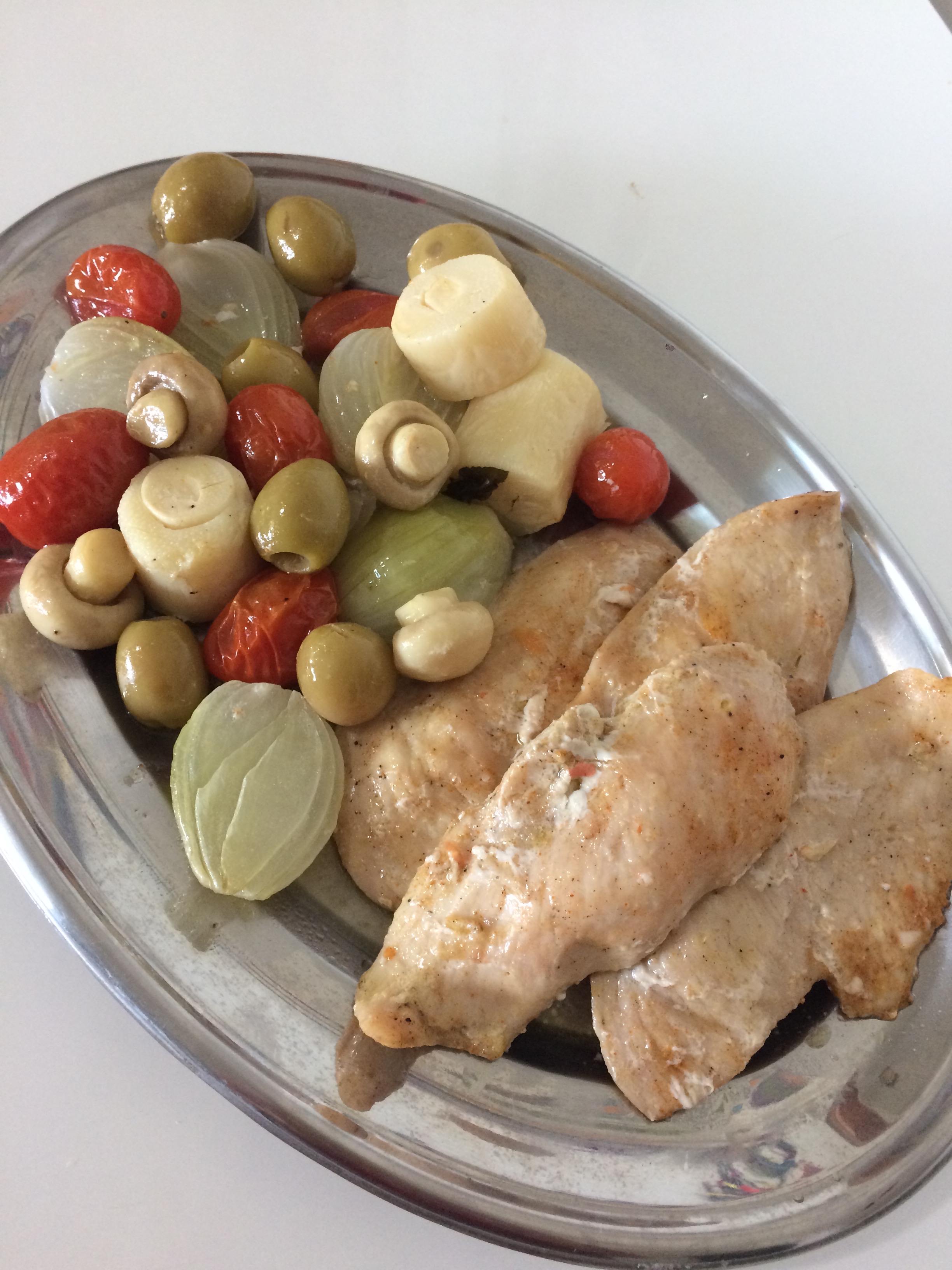 Eu coloquei palmitos, tomates cerejas, champignon, azeitonas e bastante cebola cortada ao meio.