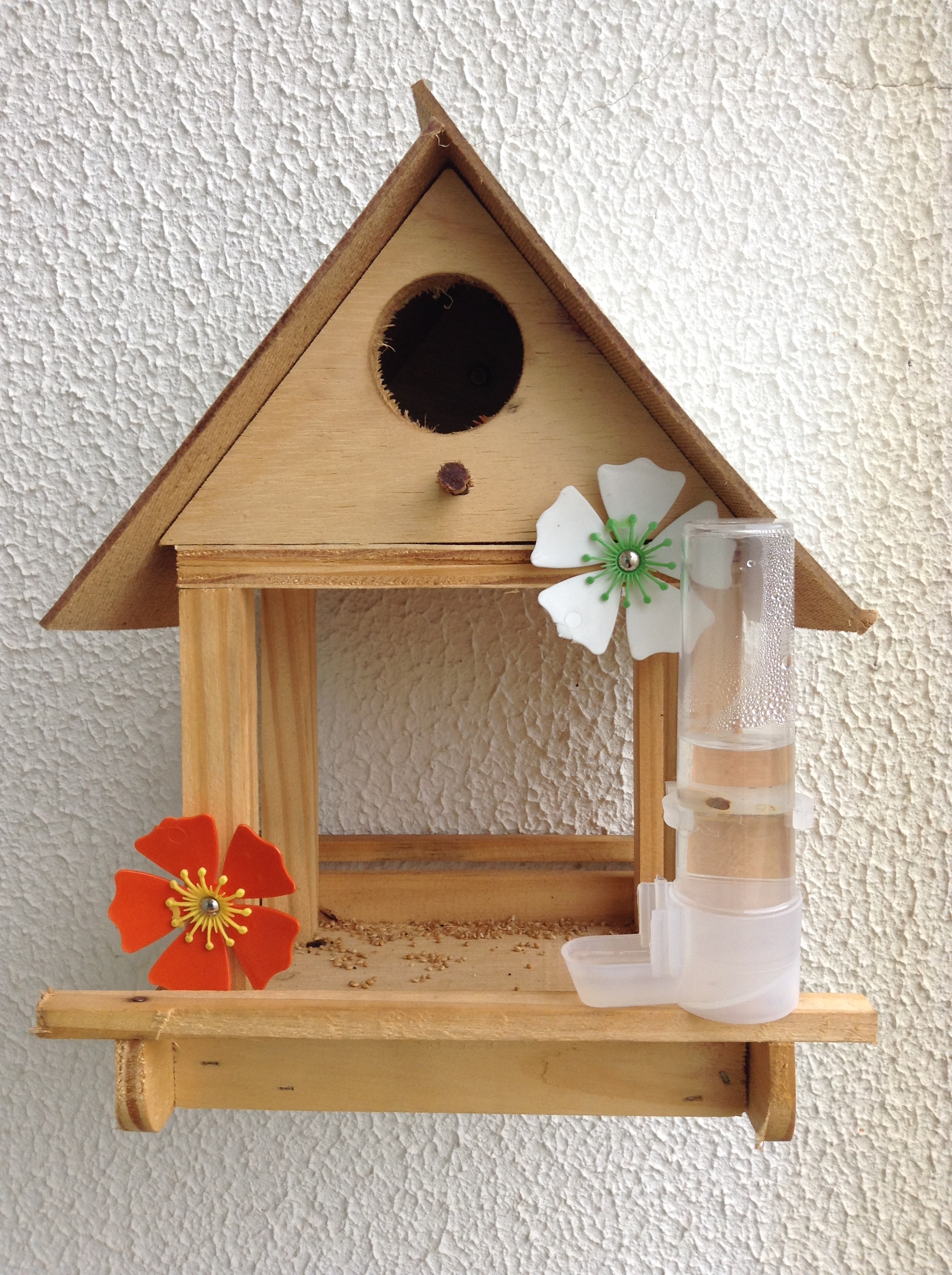 Daqui vejo a casa para os passarinhos que coloquei no muro.